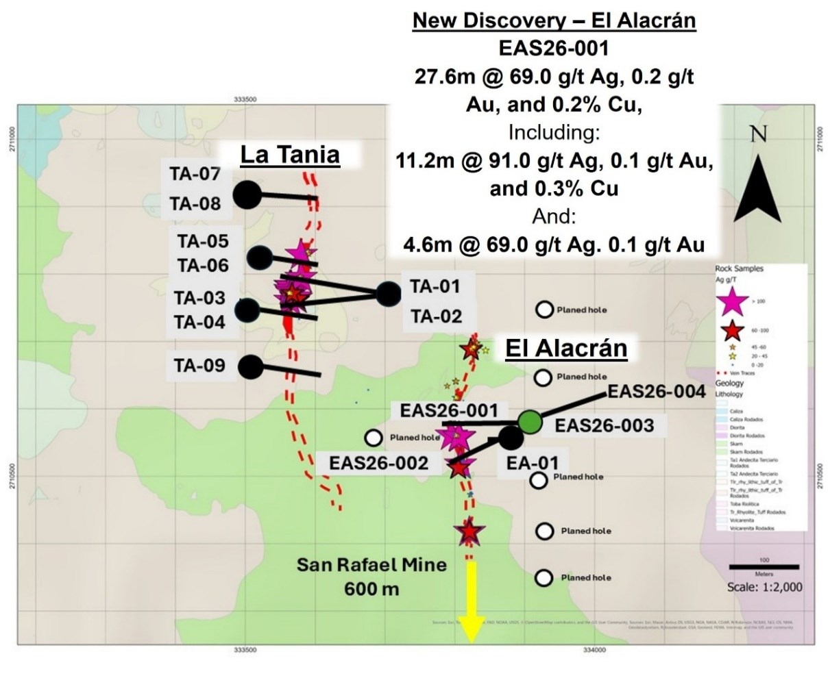 - New El Alacrán discovery 600 meters to the north of the San Rafael mine has intersected multiple Ag-Au-Cu intercepts including 27.6m @ 69.0 g/t Ag, 0.2 g/t Au, 0.2% Cu, Including: 11.2m @ 91.0 g/t Ag, 0.1 g/t Au, 0.3% Cu And: 4.6m @ 69.0 g/t Ag. 0.1 g/t Au EAS26-001 (Figure 2 and Table 7).
