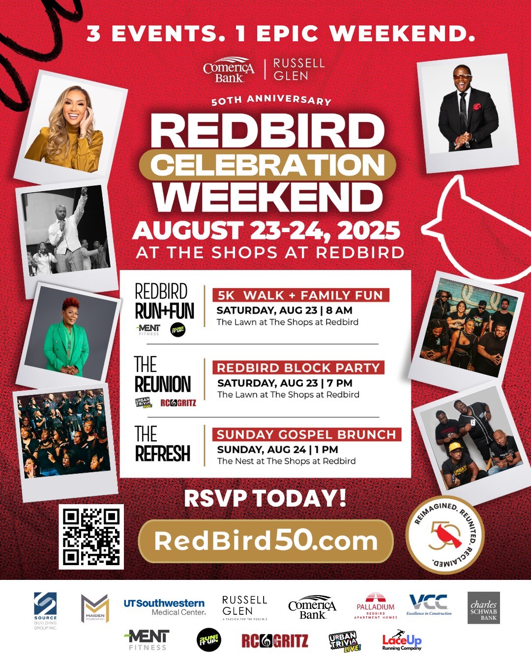 Dallas, TX, Aug. 20, 2025 (GLOBE NEWSWIRE) -- In celebration of the 50th anniversary of the Shops at RedBird (formerly Red Bird Mall), a longstanding and resilient anchor in the Southern Dallas community, Comerica Bank and Russell Glen have both joined in as title sponsors of this historic event. From Saturday, August 23 - Sunday, August 24, the greater DFW metroplex and beyond is invited to participate in three events.
