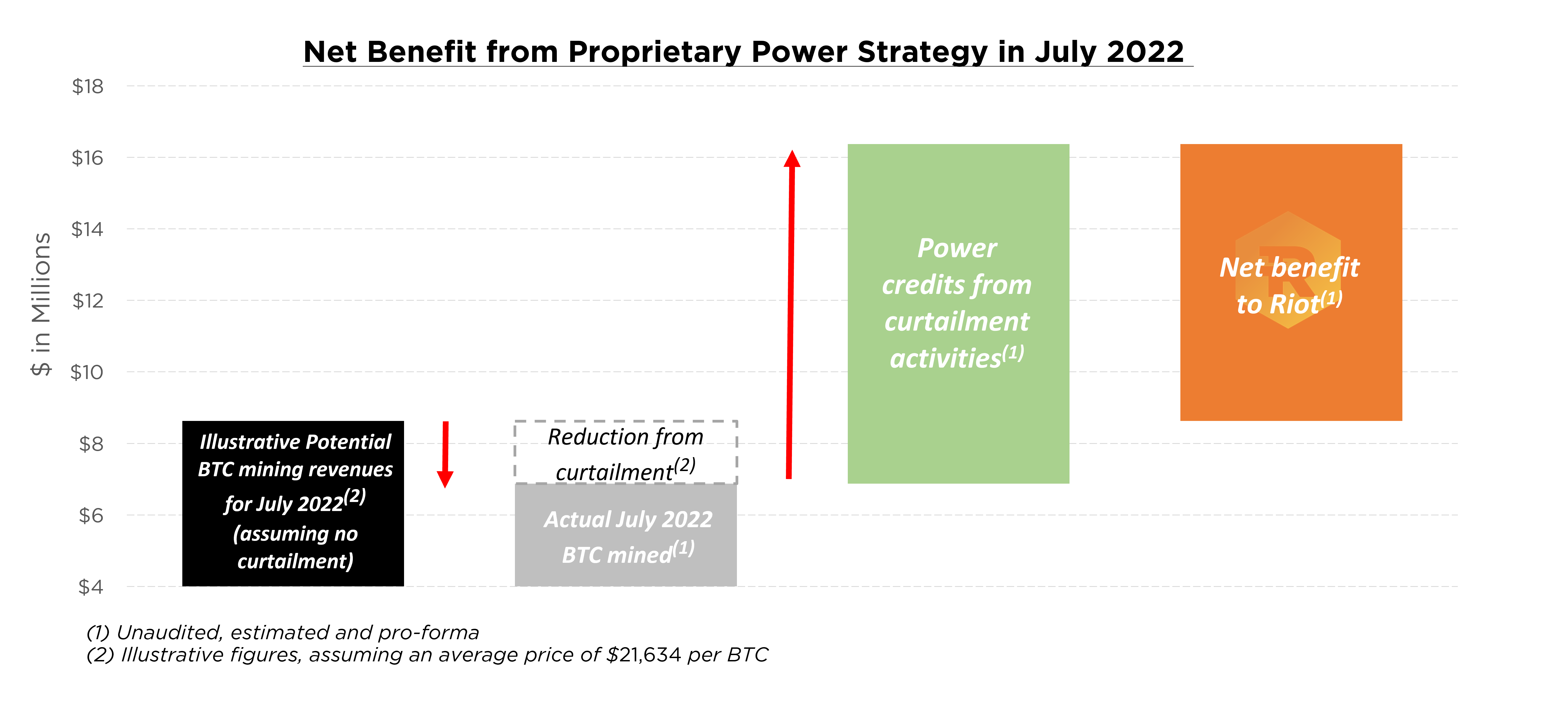 - In July 2022, Riot produced 318 BTC, a decrease of approximately 28% as compared to July 2021 production of 443 BTC, while significantly reducing overall power costs through effective employment of its proprietary power strategy.