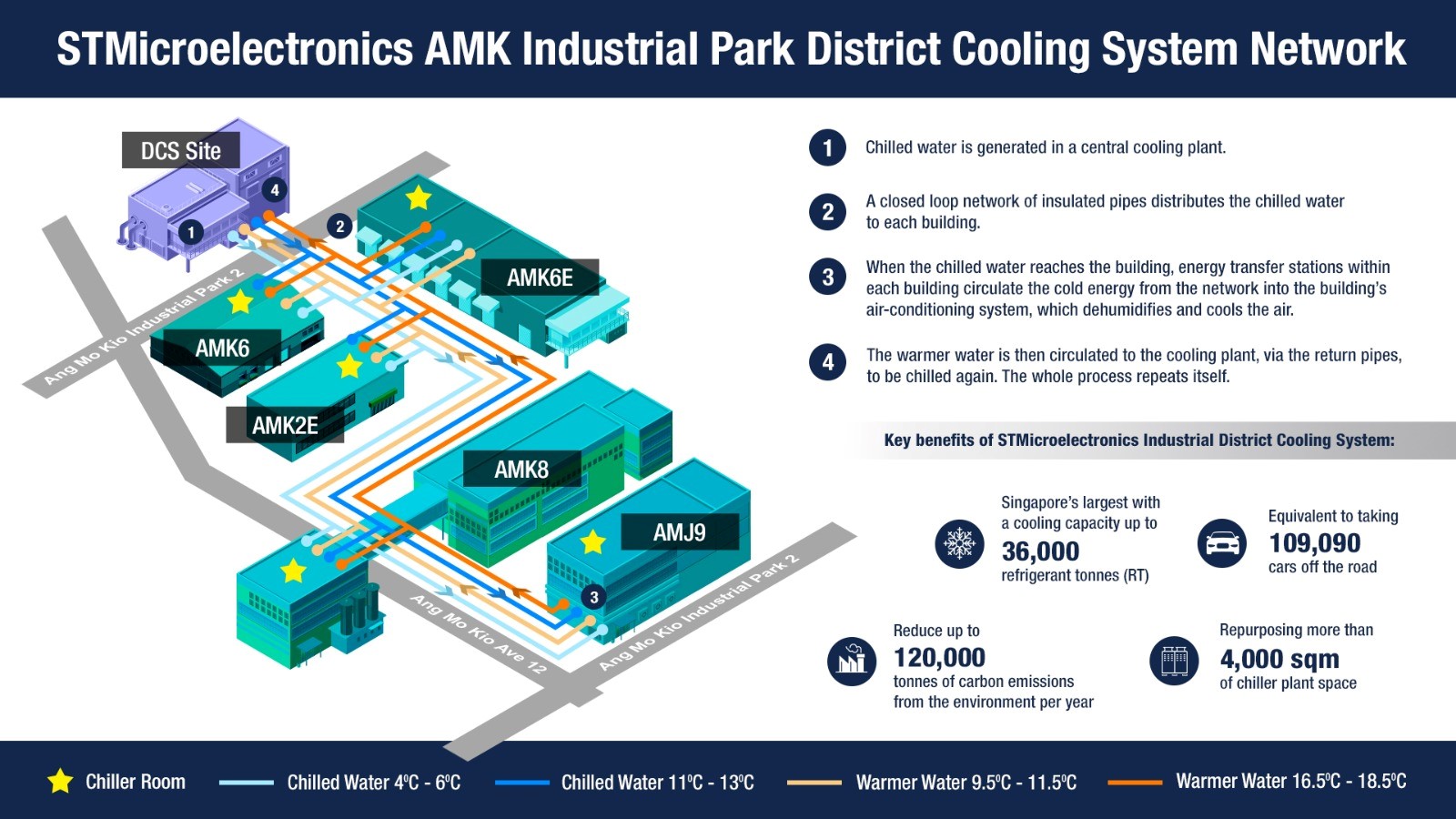 Geneva, Switzerland and Singapore, May 18, 2022 – STMicroelectronics (NYSE:STM), a global semiconductor leader serving customers across the spectrum of electronics applications, and SP Group (SP), a leading utilities group in the Asia Pacific and Singapore's national grid operator, announced today the signing of an agreement to install a district cooling system at ST AMK TechnoPark. At an estimated project value of 370 million USD over 20 years, it will be Singapore's largest district cooling system (DCS) to be implemented for an industrial development when operational in 2025.