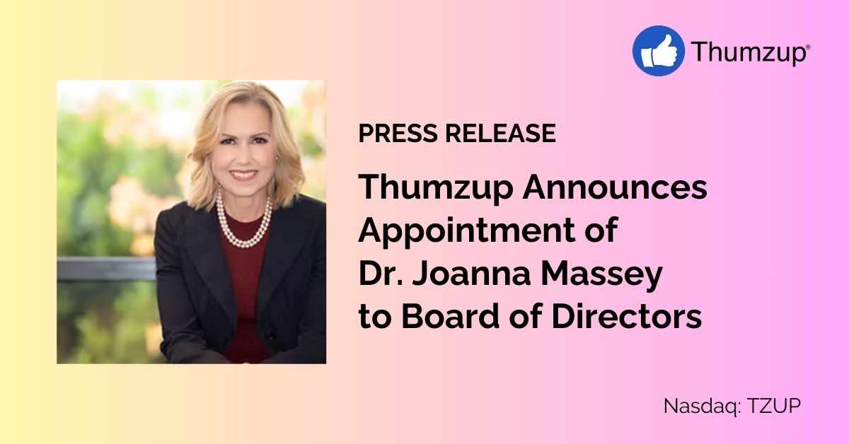 Los Angeles, CA, Jan. 16, 2025 (GLOBE NEWSWIRE) -- Thumzup Media Corporation ("Thumzup" or the "Company") (NASDAQ:TZUP), an emerging leader in social media branding and programmatic marketing solutions, is pleased to announce the appointment of Dr. Joanna Massey to its Board of Directors. Dr. Massey serves as an independent director and Chair of the Nomination and Corporate Governance Committee.